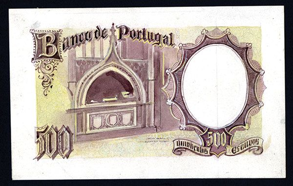 Portugal and England, ND (ca. 1938), 500 Escudos, P-151, Dramatic and impressive hand drawn and colored, 6 x 4 inch essay Reverse design for Portuguese banknote, very similar to final design, tomb at left center, Fleury, an artist and designer for Waterlow & Sons, is known for designing stamps for the 1935 King George V Silver Jubilee Issue for England as well as a 1935 Portugal 1000 Escudos Note and a number of Czechoslovakian banknotes used in the 1940's and also other banknotes and stamps. Rare and unique artwork from this well known Waterlow & Sons artist. XF condition with light mounting stains and glue remnants in a couple of small areas on back. W&S. Rare Fleury original artwork and possibly unique as well as historic.