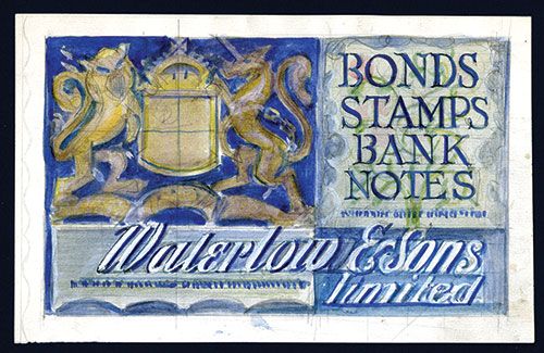 London, England, ND (ca. 1930-40's), Dramatic and impressive original hand drawn and colored, 6.5 x 4 inch advertising card in blue, green, yellow, light brown and white on thin white card, Supported Arms on left with lion and unicorn with Waterlow title below and company description of products on right, “Bonds, Stamps, Banknotes”, extremely attractive Waterlow advertising note design. XF condition with light glue stains and remnants on back, W&S.