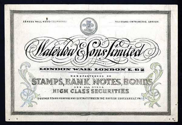 London, England, ND (ca. 1930-40's), Dramatic and impressive original hand drawn and colored, 6.5 x 4.5 inch advertising card, Ornate text with information and Waterlow & Sons title on top with description of work “Banknotes, Bonds, Stamps” on bottom, extremely attractive Waterlow advertising note design. Fleury, an artist and designer for Waterlow & Sons, is known for designing stamps for the 1935 King George V Silver Jubilee Issue for England as well as a 1935 Portugal 1000 Escudos Note and a number of Czechoslovakian banknotes used in the 1940's and also other banknotes and stamps. Rare and unique artwork from this well known Waterlow & Sons artist. XF condition with light mounting stains and glue remnants in a couple of small areas on back. W&S.