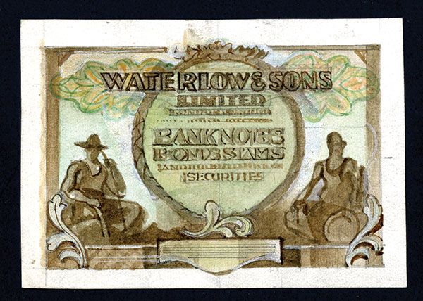 London, England, ND (ca. 1930-40's), Dramatic and impressive original small format hand drawn and colored, 3.25 x 2.25 inch advertising card, allegorical figures flank description with Waterlow & Sons title on top, extremely attractive Waterlow advertising note design. Fleury, an artist and designer for Waterlow & Sons, is known for designing stamps for the 1935 King George V Silver Jubilee Issue for England as well as a 1935 Portugal 1000 Escudos Note and a number of Czechoslovakian banknotes used in the 1940's and also other banknotes and stamps. Rare and unique artwork from this well known Waterlow & Sons artist. XF condition with light mounting stains and glue remnants in a couple of small areas on back. W&S.
