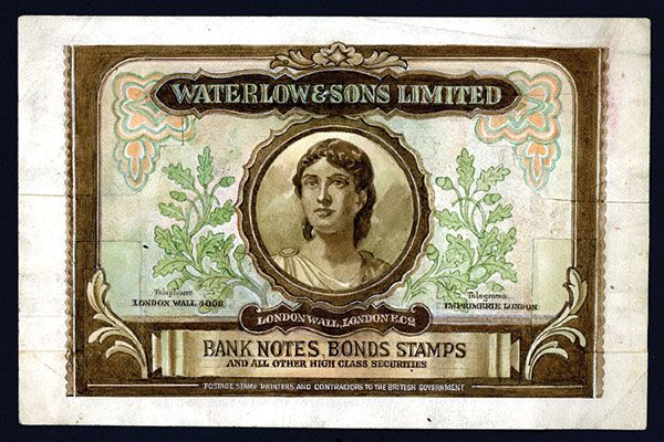 London, England, ND (ca. 1930-40's), Dramatic and impressive original hand drawn and colored, 7 x 4.75 inch advertising card, Portrait of Classical woman or young boy in middle, Plants flank portrait with ornate brown border on m/c, Waterlow & Sons title on top with description of work “Banknotes, Bonds, Stamps” on bottom, extremely attractive Waterlow advertising note design. Fleury, an artist and designer for Waterlow & Sons, is known for designing stamps for the 1935 King George V Silver Jubilee Issue for England as well as a 1935 Portugal 1000 Escudos Note and a number of Czechoslovakian banknotes used in the 1940's and also other banknotes and stamps. Rare and unique artwork from this well known Waterlow & Sons artist. XF condition with light mounting stains and glue remnants in a couple of small areas on back. W&S.