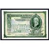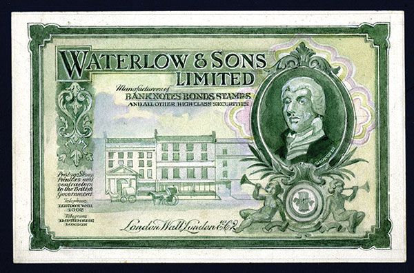 London, England, ND (ca. 1930-40's), Dramatic and impressive original hand drawn and colored, 6.5 x 4.25 inch advertising card, Portrait of George III on right with building with horses and buggy in front in middle, Ornate and very attractive, green and m/c, Waterlow & Sons title on top with description of work “Banknotes, Stamps, Bonds” on bottom, extremely attractive Waterlow advertising note design. Fleury, an artist and designer for Waterlow & Sons, is known for designing stamps for the 1935 King George V Silver Jubilee Issue for England as well as a 1935 Portugal 1000 Escudos Note and a number of Czechoslovakian banknotes used in the 1940's and also other banknotes and stamps. Rare and unique artwork from this well known Waterlow & Sons artist. XF condition with light mounting stains and glue remnants in a couple of small areas on back. W&S.