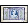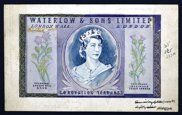 London, England, ND (ca. 1952), Dramatic and impressive original hand drawn and colored portrait of Queen Elizabeth II on 8 x 5 inch advertising card, Plants flank portrait with purple border on m/c with intaglio engraved border pieces glued to the borders of the illustration, Waterlow & Sons title on top with “Coronation Year 1953” under portrait of queen, detailed archival notations on side and back of card, extremely attractive Waterlow advertising note design. Fleury, an artist and designer for Waterlow & Sons, is known for designing stamps for the 1935 King George V Silver Jubilee Issue for England as well as a 1935 Portugal 1000 Escudos Note and a number of Czechoslovakian banknotes used in the 1940's and also other banknotes and stamps. Rare and unique artwork from this well known Waterlow & Sons artist. XF condition with light mounting stains and glue remnants in a couple of small areas on back. W&S.