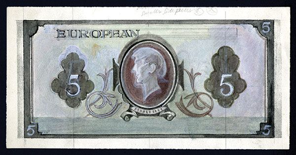 London, England, ND (ca. 1930-40's), “European” Dramatic and impressive original partially complete banknote format hand drawn and colored, 7.5 x 3.75 inch advertising card, black, brown and olive green with portrait facing left with name “Robert Broo?” drawn under portrait, with “5” numerals on left and right, “European......” on top, possibly a back for proposed banknote or advertising piece, extremely attractive Waterlow advertising note design. Fleury, an artist and designer for Waterlow & Sons, is known for designing stamps for the 1935 King George V Silver Jubilee Issue for England as well as a 1935 Portugal 1000 Escudos Note and a number of Czechoslovakian banknotes used in the 1940's and also other banknotes and stamps. Rare and unique artwork from this well known Waterlow & Sons artist. XF condition with light mounting stains and glue remnants in a couple of small areas on back. W&S.