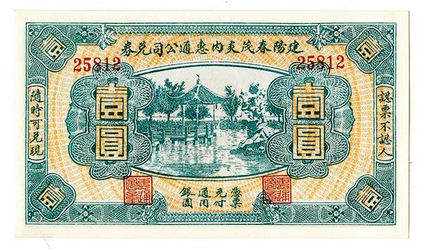 China. A private note issued by the Huitong Company in Jianyang County, Fujian Province. The face depicts an oriental garden with water features and a pavilion. Serial number is 25812. Texts around the edge are "unnamed", "pay the bearer at any time" and "could be exchanged into silver coins". Uncirculated to CU condition, The seals are of the company. The back side shows English name of the company. Scarce. (Alexander I. Pogrebetsky Family Archives, Part 2)