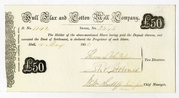 Hull, England, 1853, 1 Share = £50, I/U, Ornate counterfoil on left Uncirculated. Scarce stock certificate printed on rare parchment type of paper. Goddard and Lancaster, Printers, Hull.