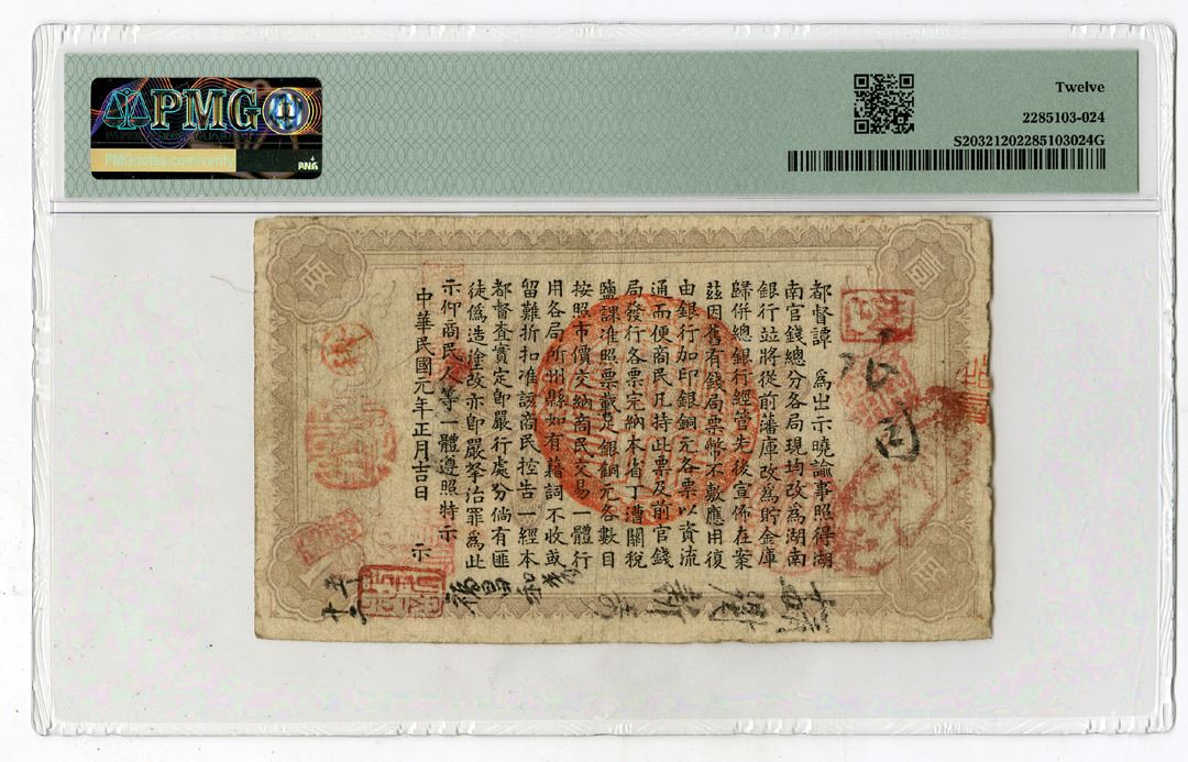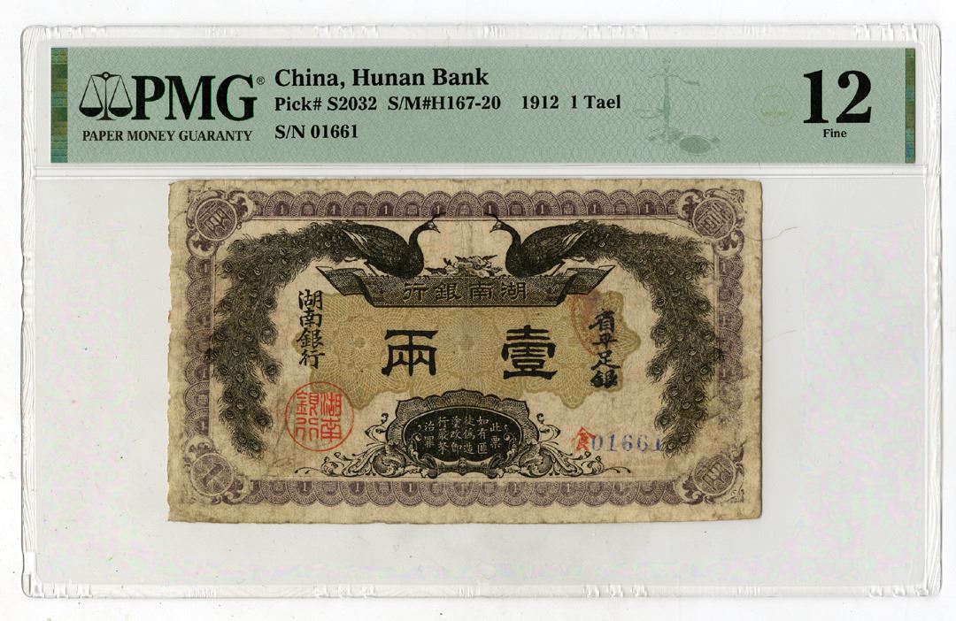 China, 1912. 1 Tael, P-S2032 S/M#H167-20, Issued Banknote, Violet black and brown print with facing peacocks at top center, Back is gray/green with multiple stamps, S/N 01661, PMG graded Fine 12.