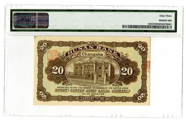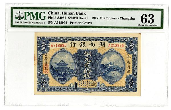 Changsha, China. Issued 20 Coppers, P-S2057, S/M#H167-51, PMG graded Choice Uncirculated 63. CMPA.