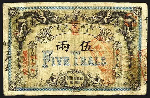 China, 5 Taels (Teals), Pick S1914b (S/M#H161-21). Black on blue border and underprint, facing dragons top center, back with large red seal, misspelled Five ìTealsî note, no internal wear holes or pinholes are seen, Fine-Choice Fine condition. Rare note with only two other note having been graded by PMG with this being in similar condition. First time offered by us.
