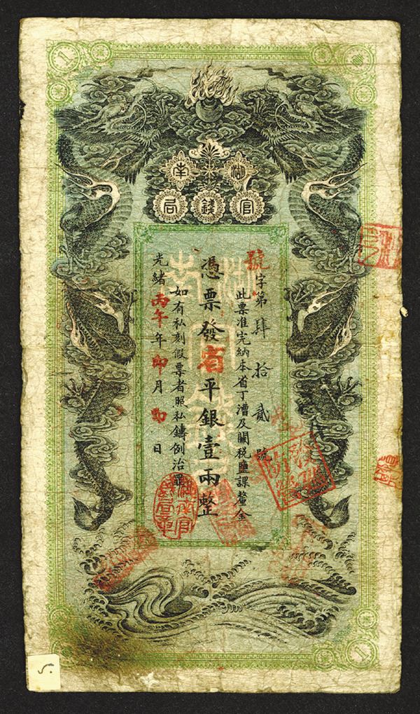 China, 1 Tael, P-S1904, S/M#H161-4, Issued banknote, black on green, back orange, facing dragons, VG to Choice VG with the usual spindle holes, graffiti, edge wear and slight soiling. Scarce note in any condition. (The Pogrebetsky Family Archives)