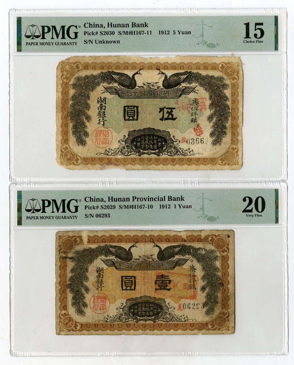 China, 1912. Lot of 2 Issued Banknotes, Includes: 1 Yuan, P-S2029 S/M#H167-10, Brown on green underprint with pair of Peacocks at top and Chinese writing on back, S/N 06293, PMG Very Fine 20 with comment "Paper Pulls;" 5 Yuan P-S2030 S/M#H167-11, Brown on green underprint with Peacocks at top and Chinese writing on back, S/N Unknown, PMG Choice Fine 15 with comments "Paper Damage & Tape." (2). The 1 Yuan note has only 3 notes grading higher in the PMG census and this is the highest graded example to be offered at public auction. The 5 Yuan example has only 12 notes graded in the PMG census. Both are rare and desirable. Sold "AS IS" no returns accepted.