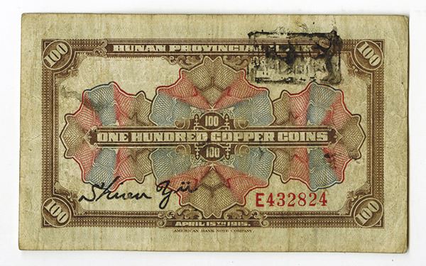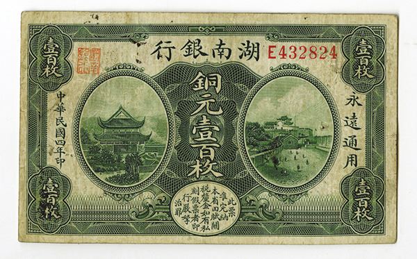 China. 1915. 100 Coppers, P-S2050, (S/M #H167-44), Green, house on left, road with walled city on right, back is brown and m/c, Serial # E432824. Fine to VF condition, ABNC.