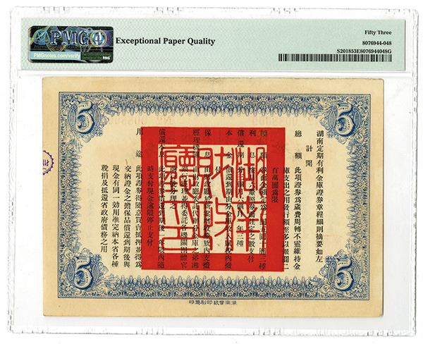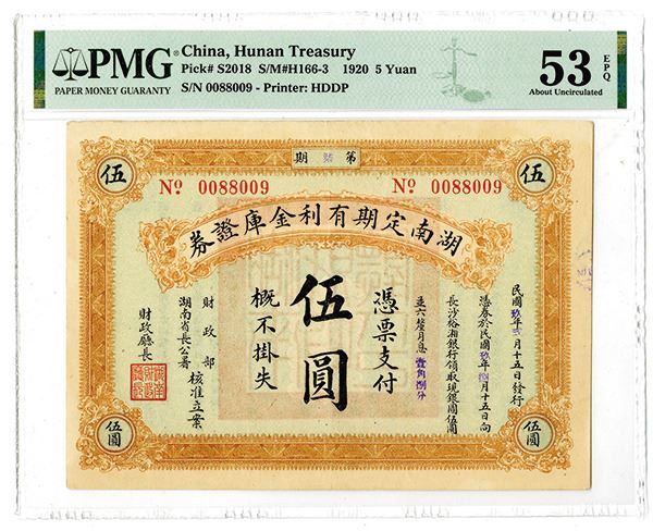 China, 1920, 5 Yuan, P-S2018, S/M#H166-3, Issued Banknote, Orange on light blue, back green and red, PMG graded About Uncirculated 53 EPQ, Rare note with only one other note grading higher out of 5 graded. Printer: HDDP
