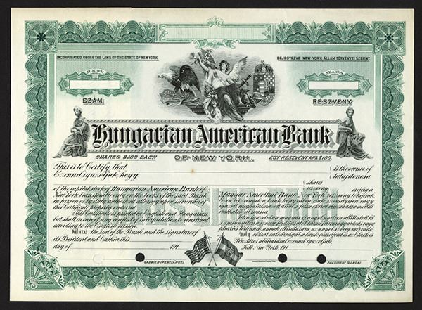 New York. 191x (ca.1910-1919). Odd Shs. Green border and undertint. Allegorical woman blowing horn flanked by Patriotic American eagle on shield and Arms of Hungary, title flanked by allegorical man and woman and bottom has flags of the U.S. and Hungary. POC's. SBNC. Rare banking stock. (From the collection of John E. Herzog).