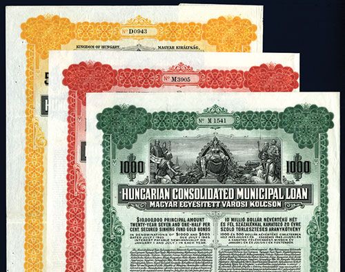 Hungary, Lot of 3 bonds, all with coupons attached, Includes 1925, $1000, black on green; 1926, $500, black on yellow; and $1000, black on red border.