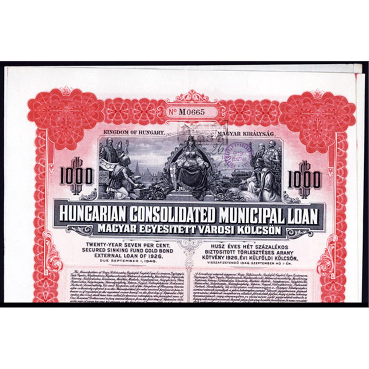 Hungary, 1926, $1000, 7% External Loan of 1926, Coupons attached, Red and black, Fine condition. W&S.