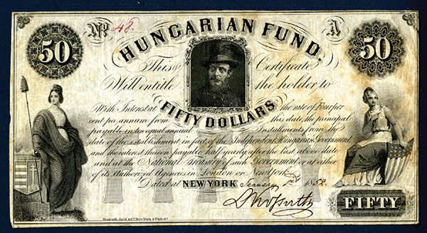New York and Hungary, 1852, $50, pp A, P-S139, Issued banknote, Black on light brown paper, portrait of Kossuth in middle and allegorical Liberty Women flanking portrait, Hand signed by Kossuth as well as hand written date, S/N 48, Choice VF condition with light foxing on the right, rare note in any condition.