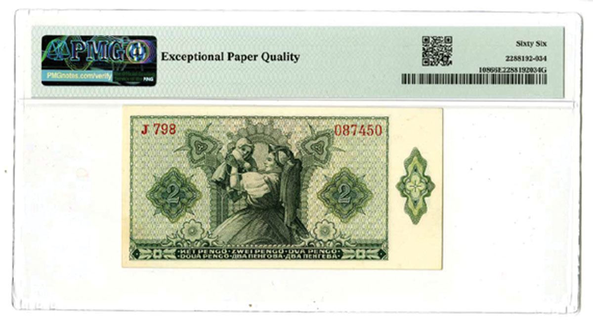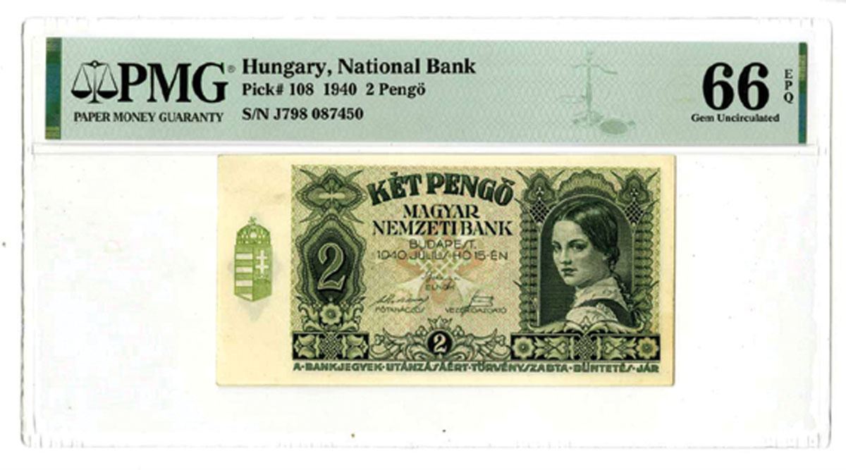 Hungary, 1940. 2 Pengo, P-108, Issued Banknote, Green on peach underprint, Arms at left and portrait of Valeria Rudas at right, Back is green with woman holding child aloft, S/N J798 087450, PMG graded Gem Uncirculated 66 EPQ.