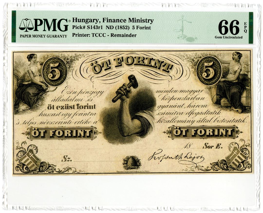 Hungary. ND (1852). 5 Forint, P-S143r1, Remainder banknote, PMG graded Gem Uncirculated 66 EPQ. Printer: TCCC.