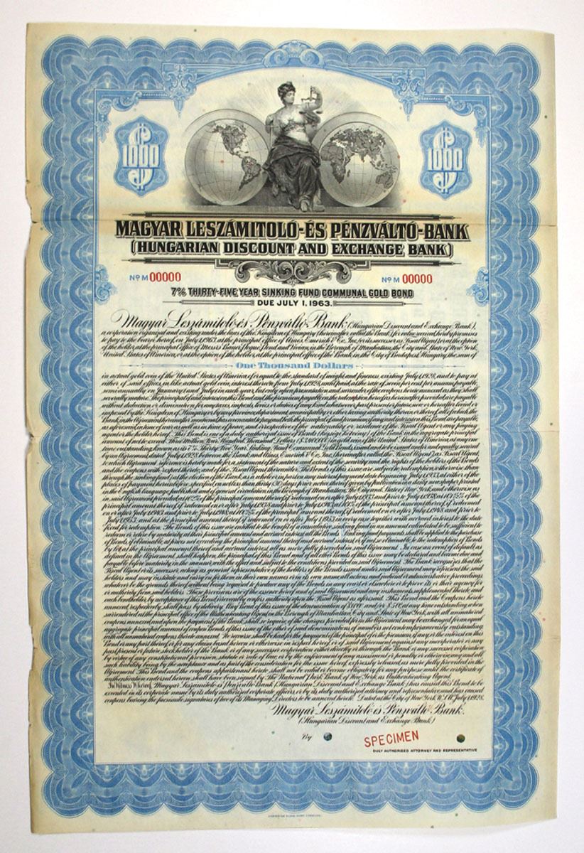 Hungary, 1928. $1000 Specimen 7% Thirty-Five Year Sinking Fund Communal Gold Coupon Bond, Black text with bright blue border and undertint, Justice at top center flanked by two globes, Specimen overprints and POCs, Fine to VF condition with damage at left side, ABNC.