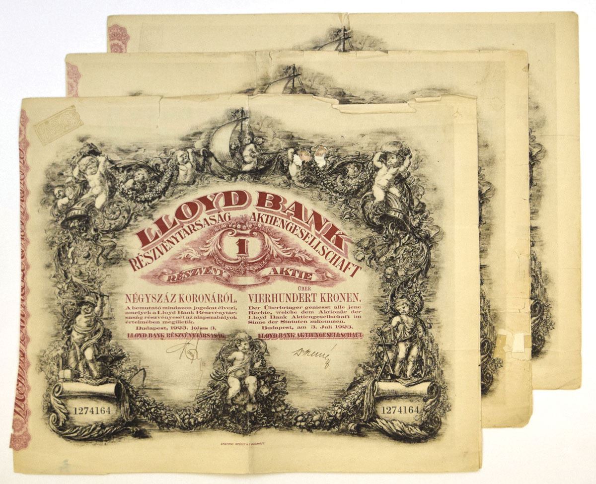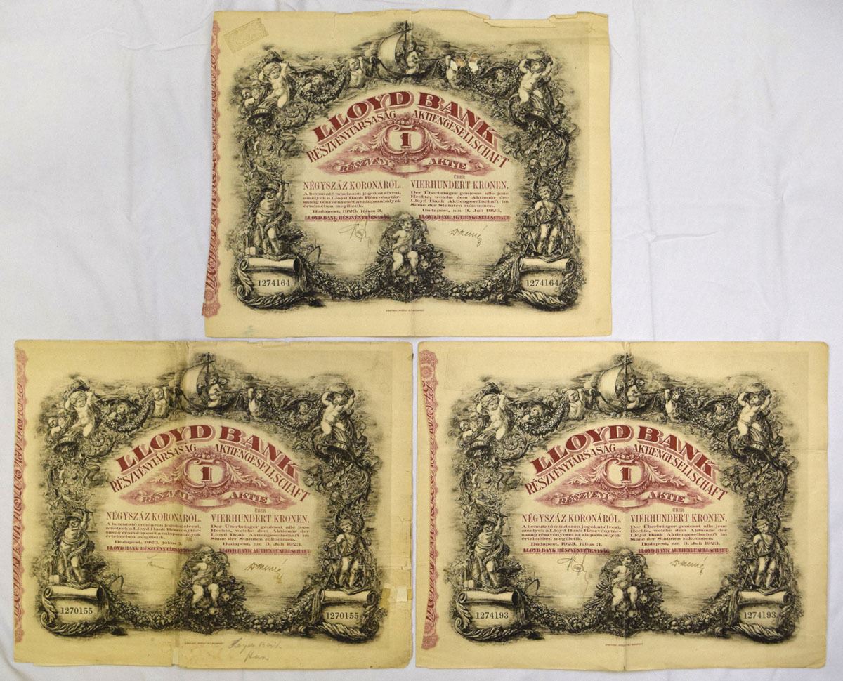 Hungary, 1923. Lot of 3 I/U share certificates each representing shares valued at 400 Kronen. Certificates are printed in Hungarian and German and feature elaborate allegorical engravings, ornate borders, serial numbering, and authorized signatures. All examples are of the same general design with differing serial numbers. Condition ranges from VG to VF overall, with heavy handling wear, edge losses, folds, repairs, and areas of paper loss consistent with early European banking certificates. (3). Sold “AS IS” no returns accepted.