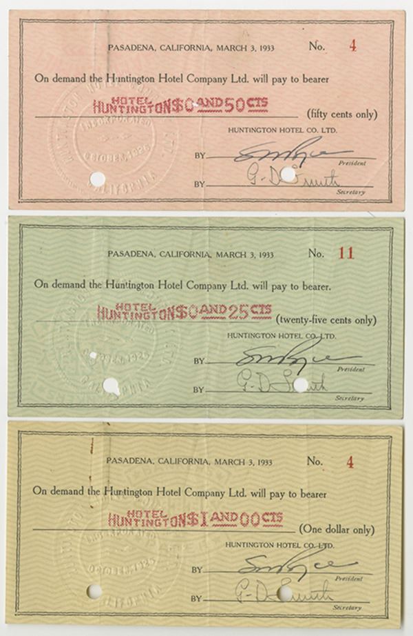 Pasadena, CA. Lot of 3 notes, includes 25 Cents; 50 Cents; and 1 Dollar, 1933, depression era scrip notes payable on demand to bearer. All with very low serial numbers, 25cts, S/N 11; 50 cts, S/N 4; and $1, S/N 4. POC. VF-XF. (3)