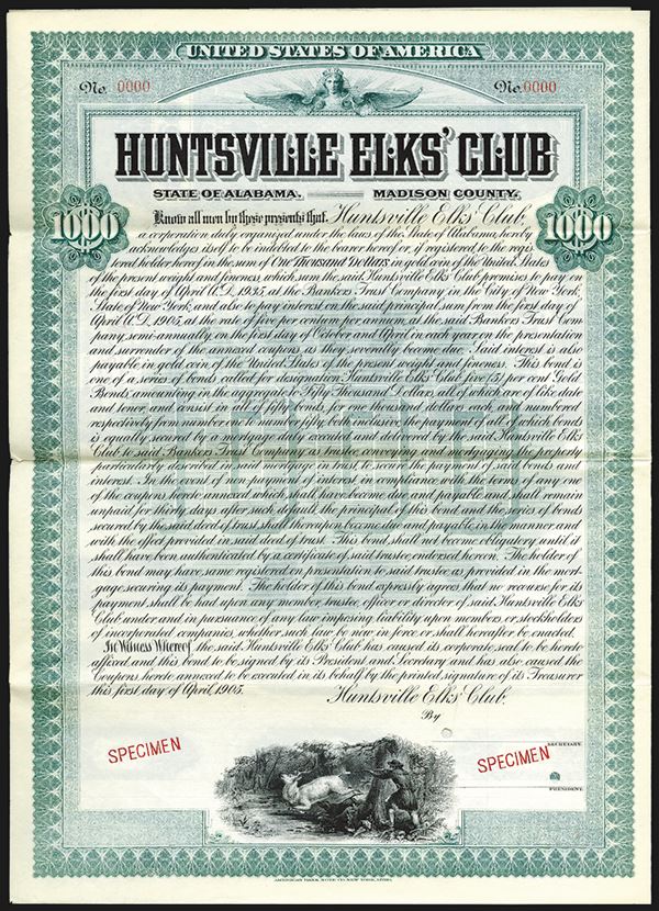 Madison County, Alabama. $1000 Specimen 5% Gold Coupon Bond, Black on light green border and underprint, Hunter shooting elk on bottom, Rare bond with only 3 found in the archives. Possibly Hunting related. ABNC.