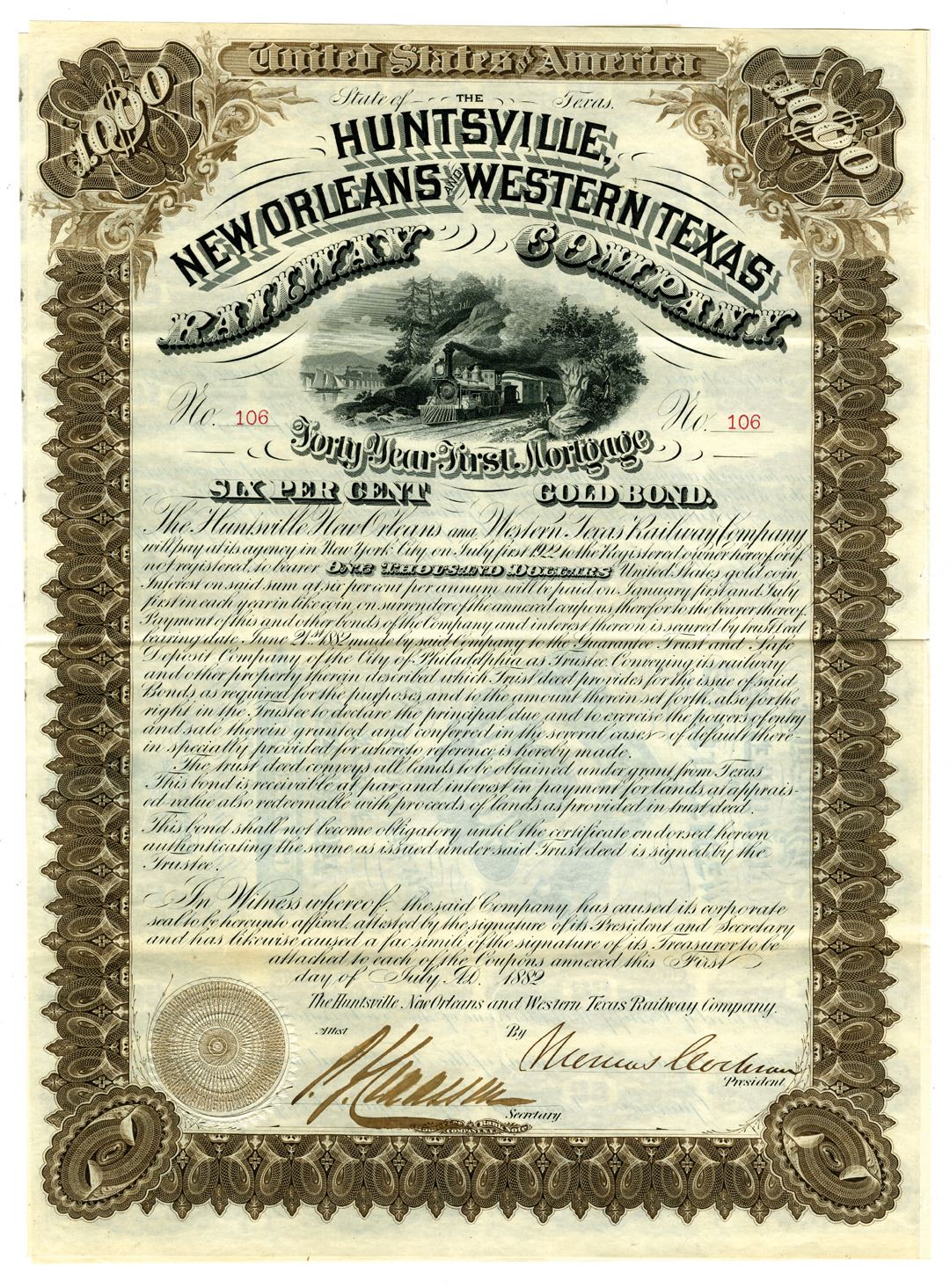 Texas and Louisiana, 1882. $1000, I/U, 6% Gold Coupon Bond, Black on brown border, train leaving tunnel under ornate title, S/N 106, VF to XF condition, Very Attractive, Homer-Lee BNC.