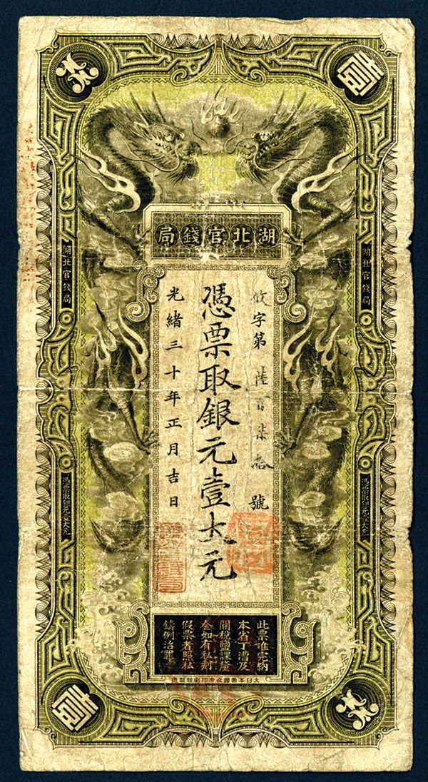 China, 1 Yuan, P-S2090 (S/M#H171-10), Issued banknote, Black on light green underprint, Facing dragons on left and right, back orange with text in black, Fine to Fine+ Condition with very small edge faults on the right margin and a very small wear area in the middle below the heads of the two dragons, otherwise a collectible example of this rare note that is missing from most advanced collections.
