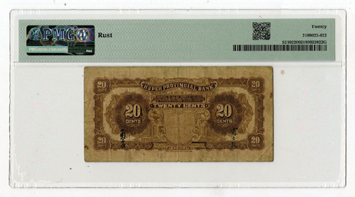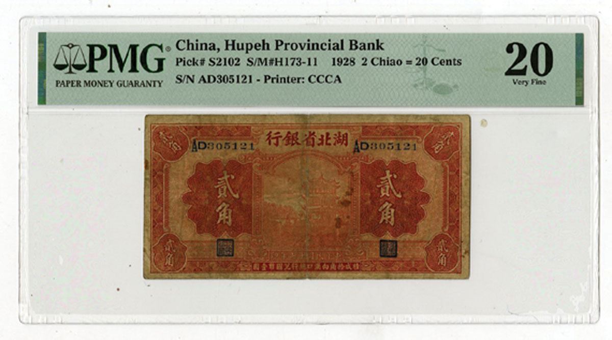 China, 1928. 2 Chiao = 20 Cents, P-S2102 S/M#H173-11, Issued Banknote, Red printing with pagoda at center, S/N AD305121, PMG graded Very Fine 20 with comment "Rust", CCCA.