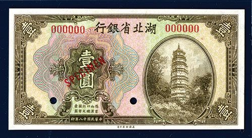 1 Yuan, P-S2104cts (S/M#H173-20), Specimen Color Trial, Olive green on m/c instead of issued violet and m/c, Pagoda at right, back blue, PMG graded Gem Uncirculated 66 EPQ, Amazing high grade note rarely seen as specimen, this lovely example is an extremely rare if not unique color trial. ABNC. This is the only example graded in the PMG census.