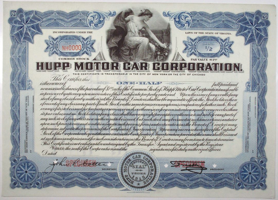 Virginia, ND (1940s). 1/2 Share Specimen Stock Certificate, Black text with blue border and underprint, Allegorical woman with flowers at top center. Red specimen overprints, NH0000 serial number, and POCs. Fine-VF condition, RBN.