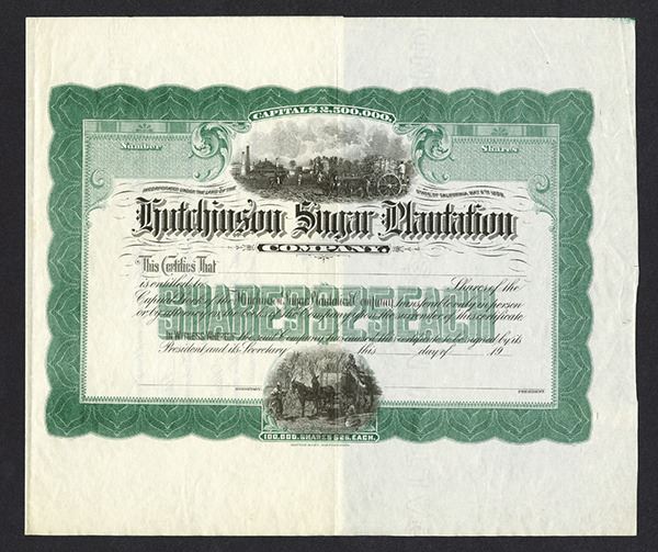 California. Proof Stock, Odd Shares, Black on green border and underprint, Refinery at top with wagon of sugar cane and sugar cane workers at bottom, VF-XF, Britton & Rey, San Francisco. Rare early sugar certificate either from the Caribbean or Hawaii.