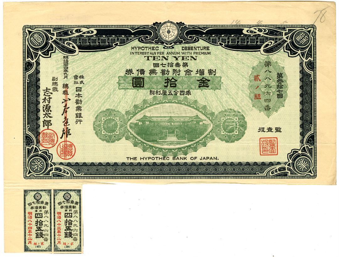 Japan, 1920s (ND). 10 Yen I/U, 4.5% Coupon Bond, Black print with dark blue border and green undertint, written in Japanese and English. VF condition.