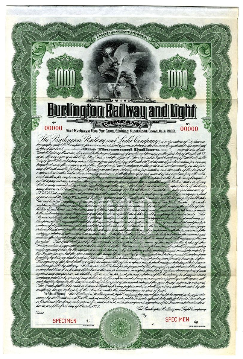 Iowa (Inc. in Delaware). $1,000 Specimen 5% 1st Mortgage Sinking Fund Gold Coupon Bond, Black print on green border and under tint, Allegorical winged man at top, Specimen overprints and POC's, VF-XF condition, ABNC.