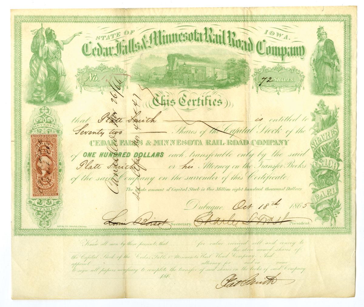 Dubuque, Iowa, 1865. 72 Shares Capital Stock I/C Certificate, Green print with green border, Company title at top with train vignette below and allegorical women at left and right, 25 Cent revenue stamp at bottom left, S/N 15, Hand cancelled across center with signatures marked out. VF to XF condition with minor stains.