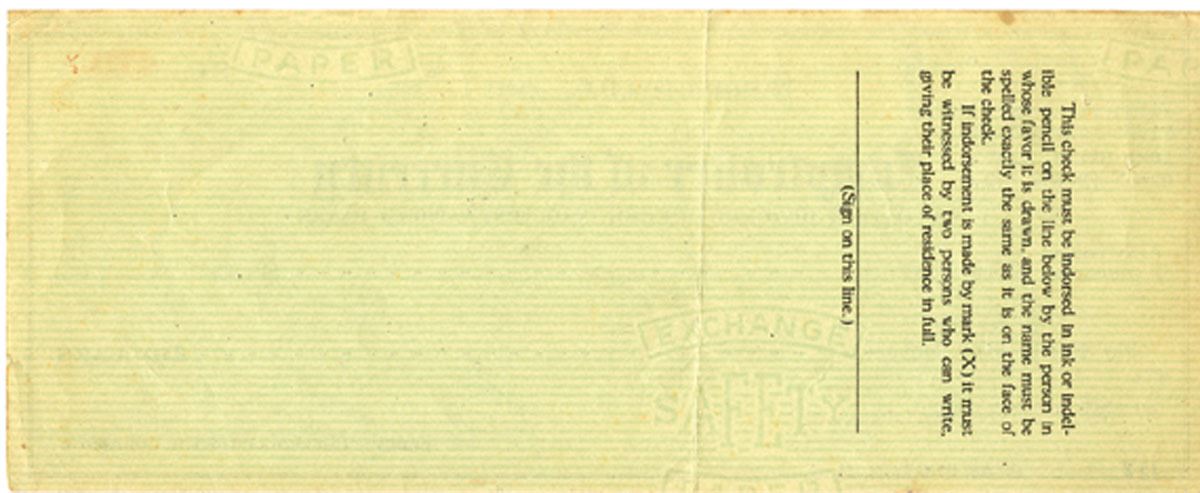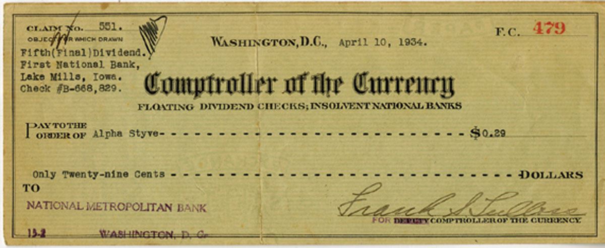 Lake Mills, Iowa, and Washington, D.C.. April 10, 1934, I/U draft for 29 cents, issued by the "Comptroller of the Currency, Floating Dividend Checks; Insolvent National Banks", Back printing on light green paper, evidently issued to a customer of an insolvent bank, this draft was issued for the "Claim No. 551", "Fifth (Final) Dividend, First National Bank, Lake Mills, Iowa., Check # 479, Signed for the Comptroller of the Currency. AU condition with light toning.