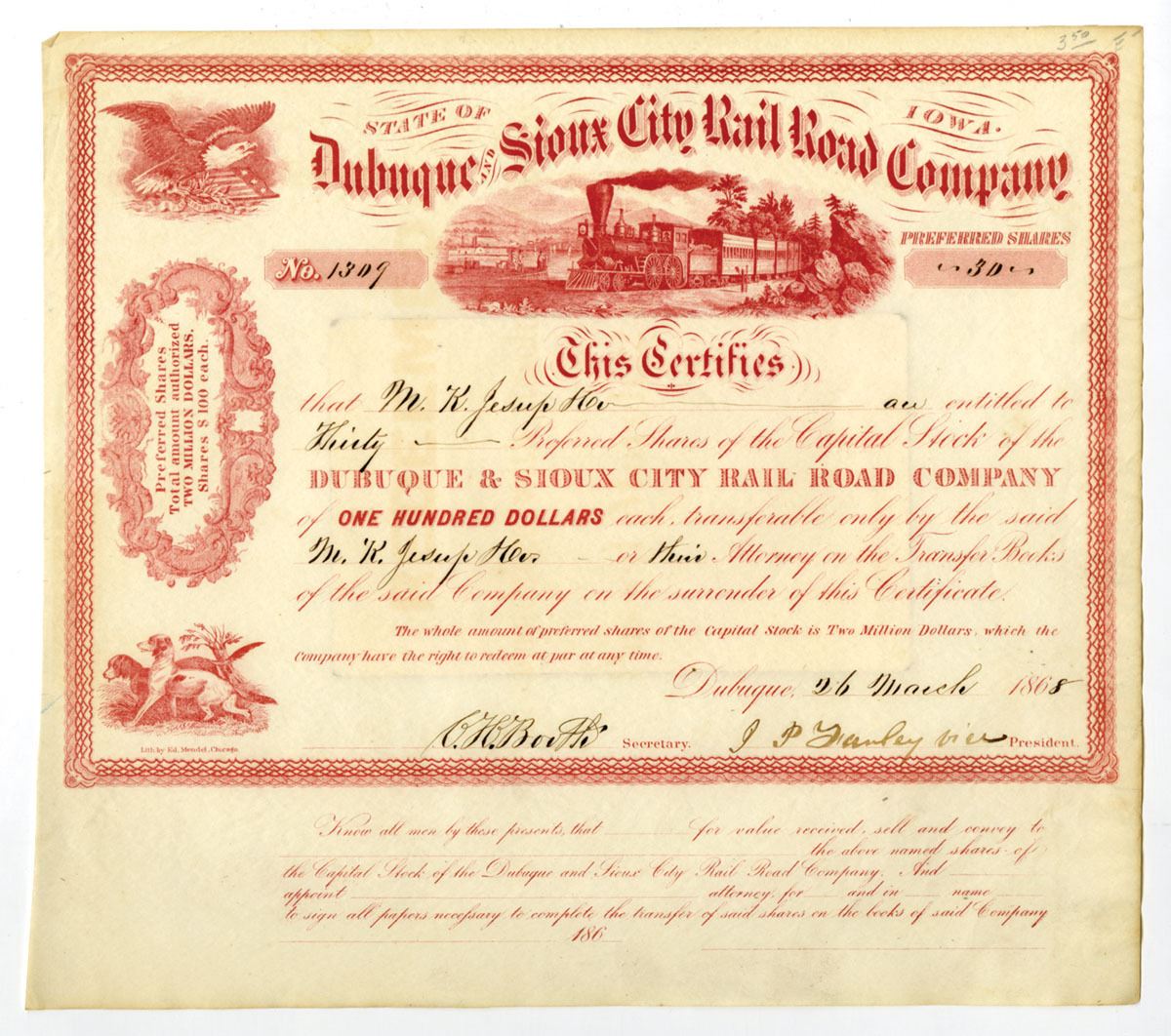 Dubuque..., Iowa, 1868. 30 Shares Preferred Shares of Capital Stock I/U Certificate, Red print with red border, Company title at top with train vignette below and Bald Eagle at top left corner and dogs at bottom left corner, S/N 1309, XF to AU condition.