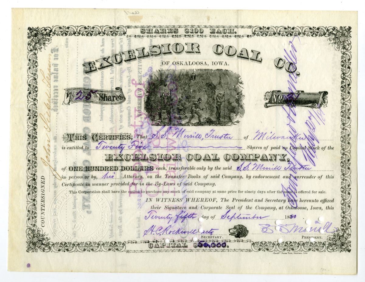 Oskaloosa, Iowa, 1880. 25 Shares Capital Stock I/C Certificate, Black print with black border, Mining vignette under company title at top center, POCs and hand cancelled over certificate, VF to XF condition.