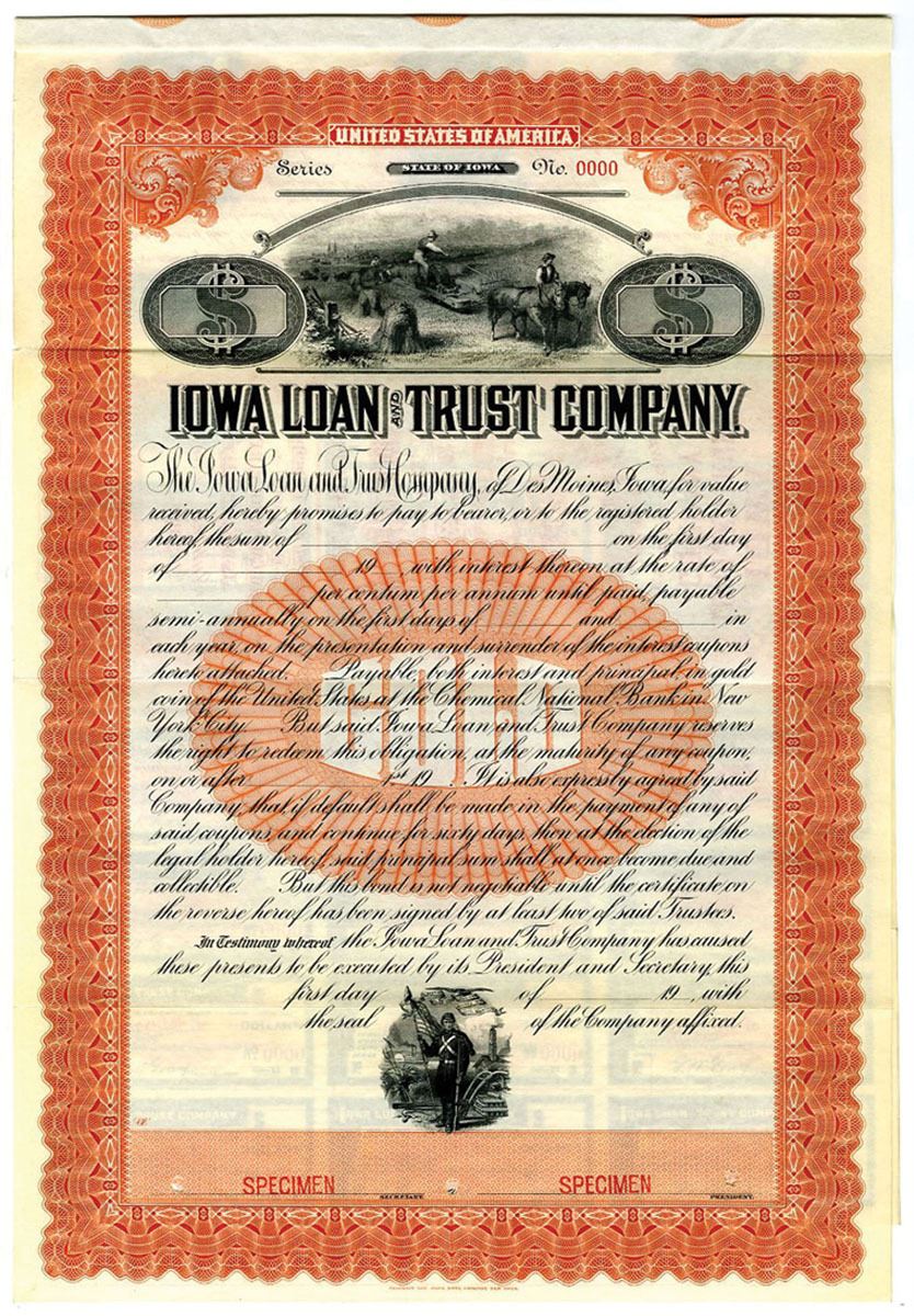 Iowa. $-Odd Specimen odd% Coupon Bond, Black print on orange border and under tint, Men plowing field at top, Specimen overprints and POC's, VF-XF condition, FLBNC.