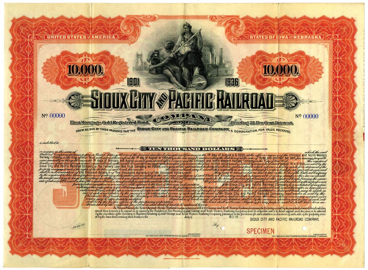 Iowa and Nebraska. $10,000 Specimen 3 1/2% 1st Mortgage Gold Registered Bond, Black print on red/orange border and under tint in horizontal format, Image of allegorical figures, male with a model locomotive and female with a sword with City skyline behind them, Specimen overprints, POC's, VF-XF condition, ABNC. Listed Railroad Type, Unlisted Bond type on Cox.