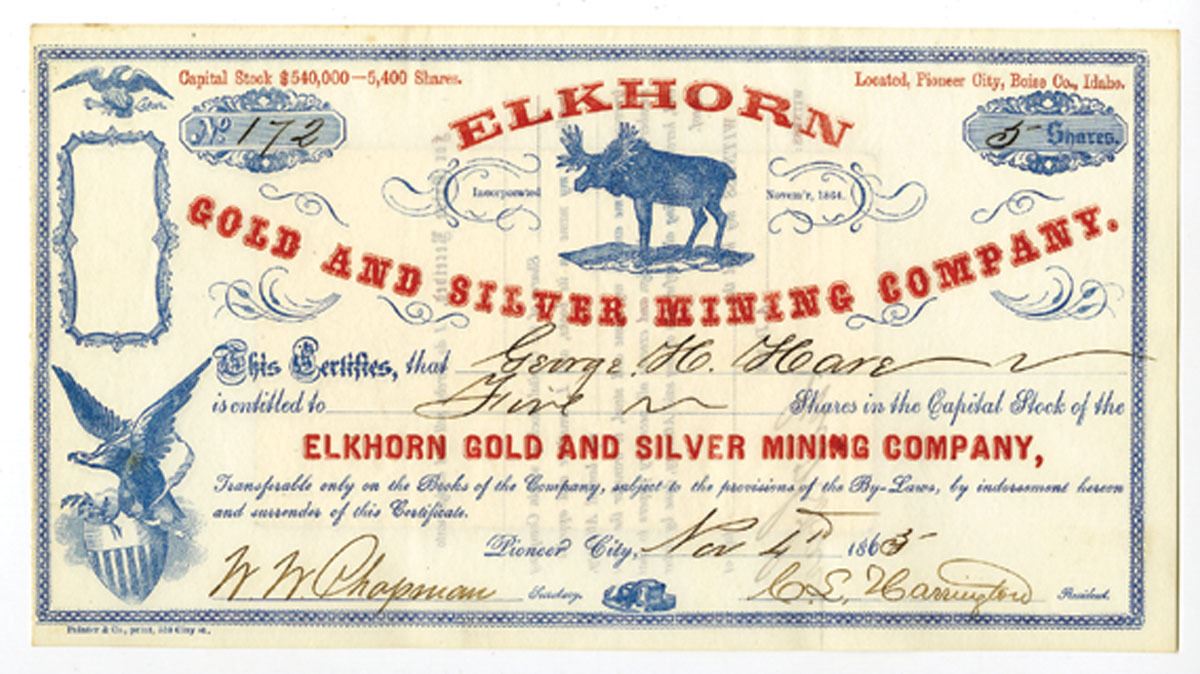 Pioneer City..., Boise County, Idaho Territory, Nov. 4, 1865, Elkhorn Gold and Silver Mining Company, 5 Shares I/U stock certificate, S/N 172, printed in red and blue with central vignette of a moose (not and elk) at top center, additional patriotic eagle vignette at lower and upper left, and ornate border design, certificate issued to George H. Hare and signed by company officers, an attractive early Idaho territorial mining stock, issued during the Boise Basin Gold Rush, one of the pioneering mining companies in the Boise Basin; Uncirculated condition. Printed by Painter & Co., San Francisco. an extremely attractive and rare stock certificate.