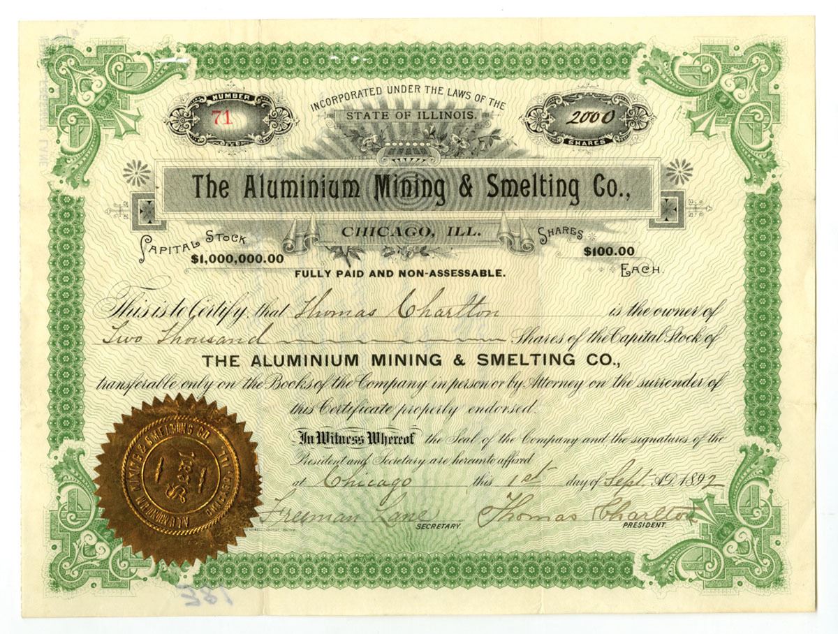 Chicago, Illinois, 1892. 2000 Shares Capital Stock I/U Certificate, Black print with green border and underprint, Company title at center with gold embossed seal at bottom left, S/N 71, XF to AU condition.