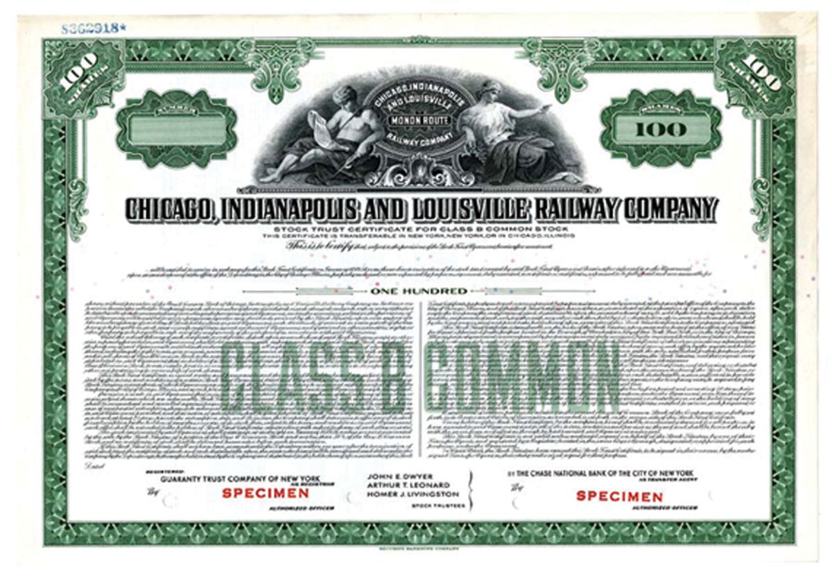 Illinois. 100 Shares Class B Common Stock Specimen Certificate, Black print on green border and under tint, Allegorical figures sitting beside company title, Specimen overprints and POC's, VF-XF condition, SBNC.