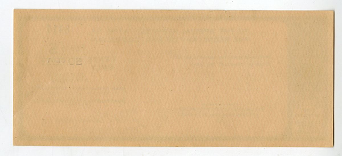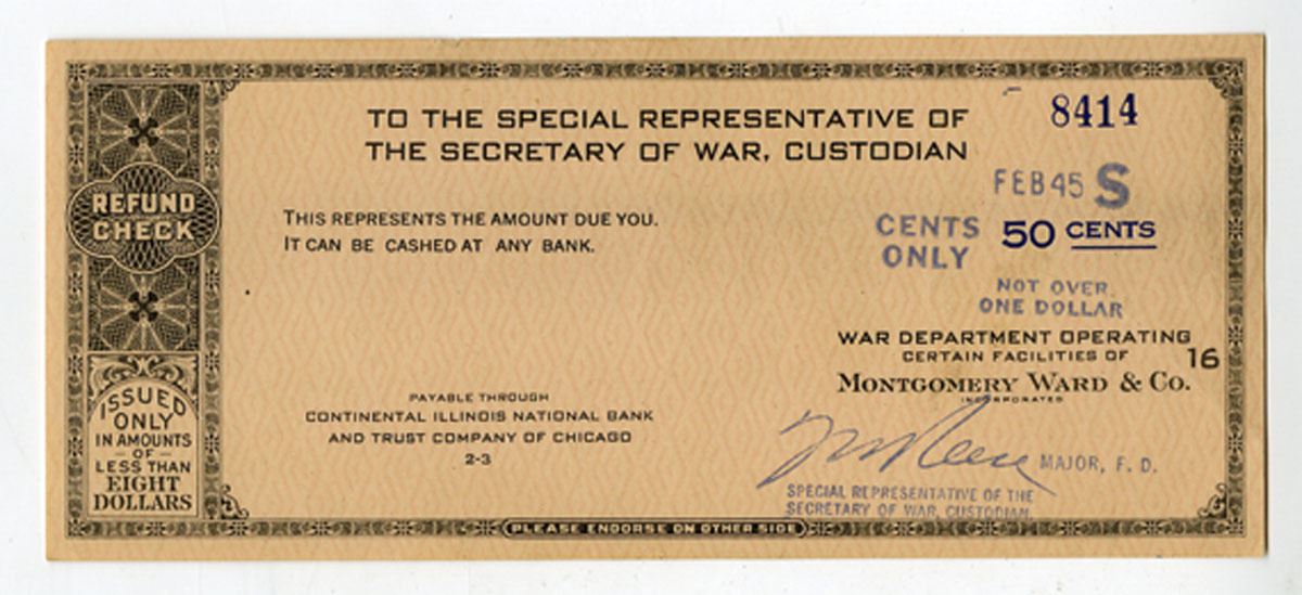 Illinois and Washington, D.C., Feb, 1945, Refund Check for 50 Cents, Black printing on light orange paper. Uncirculated.