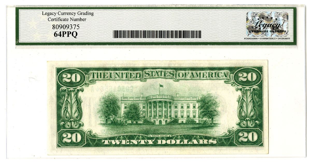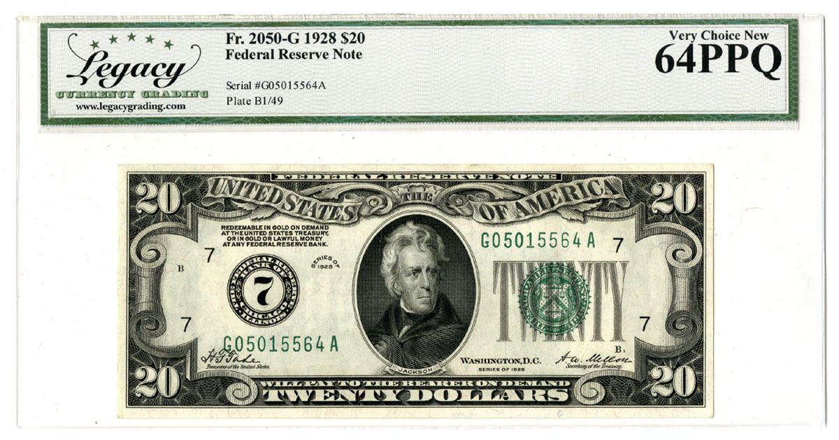 Chicago, Illinois, 1928. $20, P-422, Fr.# 2050-G, Series of 1928, Issued Banknote, Black print with Andrew Jackson at center, Back is green with White House at center, Green seal at right, S/N G05015564A pp B1/49, Legacy graded Very Choice New 64PPQ.