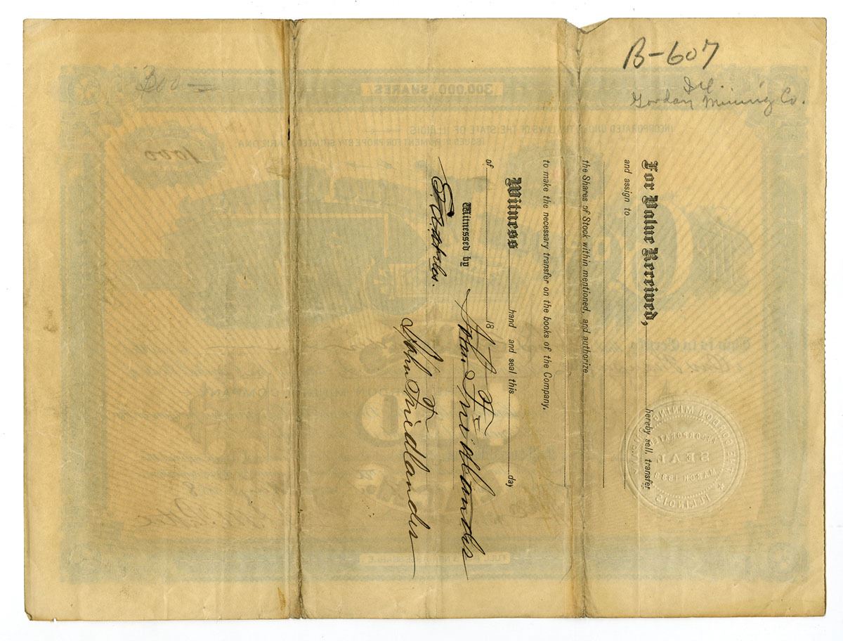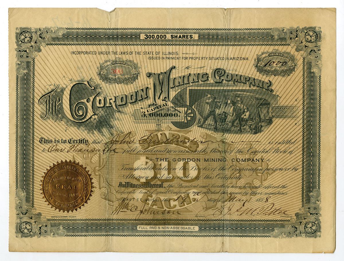 Illinois (with Mine in Arizona). 1000 Shares I/U Stock Certificate, Black and blue print with blue border and brown underprint, Mining vignette to right of title at top, Gold embossed seal at bottom left corner, S/N 306, VF condition. The Gordon Mining Company was incorporated in Illinois in 1886, issued in payment for property located in Arizona. This company was part of the wave of Midwest-financed ventures seeking to profit from Arizona’s expanding silver and copper mining frontier in the 1880s. Although little documentation of operations remains, the certificate’s bold engraving and mining vignette typify the promotional style of late-19th-century speculative mining corporations.