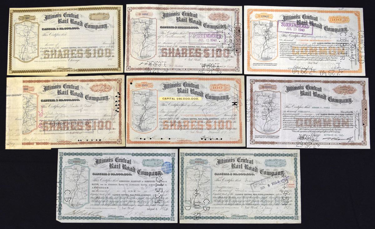 Illinois, 1874-1943. Lot of 8 Certificates, 7 are I/C and 1 is U/U, all for Varying Shares and Colors, all have same vignette at left - map of railroad route through the Midwest, Stocks are in Fine to XF condition with POCs, (8). Sold "AS IS" no returns accepted.