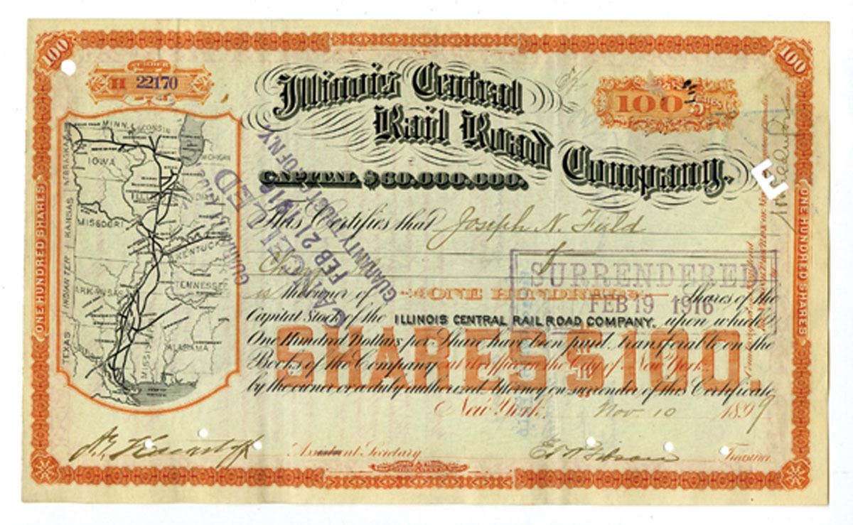 Illinois, 1899. 100 Shares I/C Capital Stock Certificate, Black print with orange border and underprint, Map of train lines from Illinois to Gulf of Mexico at left, Company title at top, Issued to but not signed by Field. The back is endorsed but signed by Stanly Field "for the estate of Joseph N. Field". Joseph N. Field was an American businessman and corporate officer active in the late 19th century. He served as a trustee, director, or executive in a number of railroad, insurance, and financial companies during the post–Civil War industrial boom. By the 1890s he was well established in corporate circles, appearing on stock and bond issues as an officer or signatory. Field’s career reflects the generation of financiers who helped manage the rapid expansion of transportation and utilities in the United States at the turn of the century. POCs and stamp cancelled, VF to VF+ condition. ABNC.