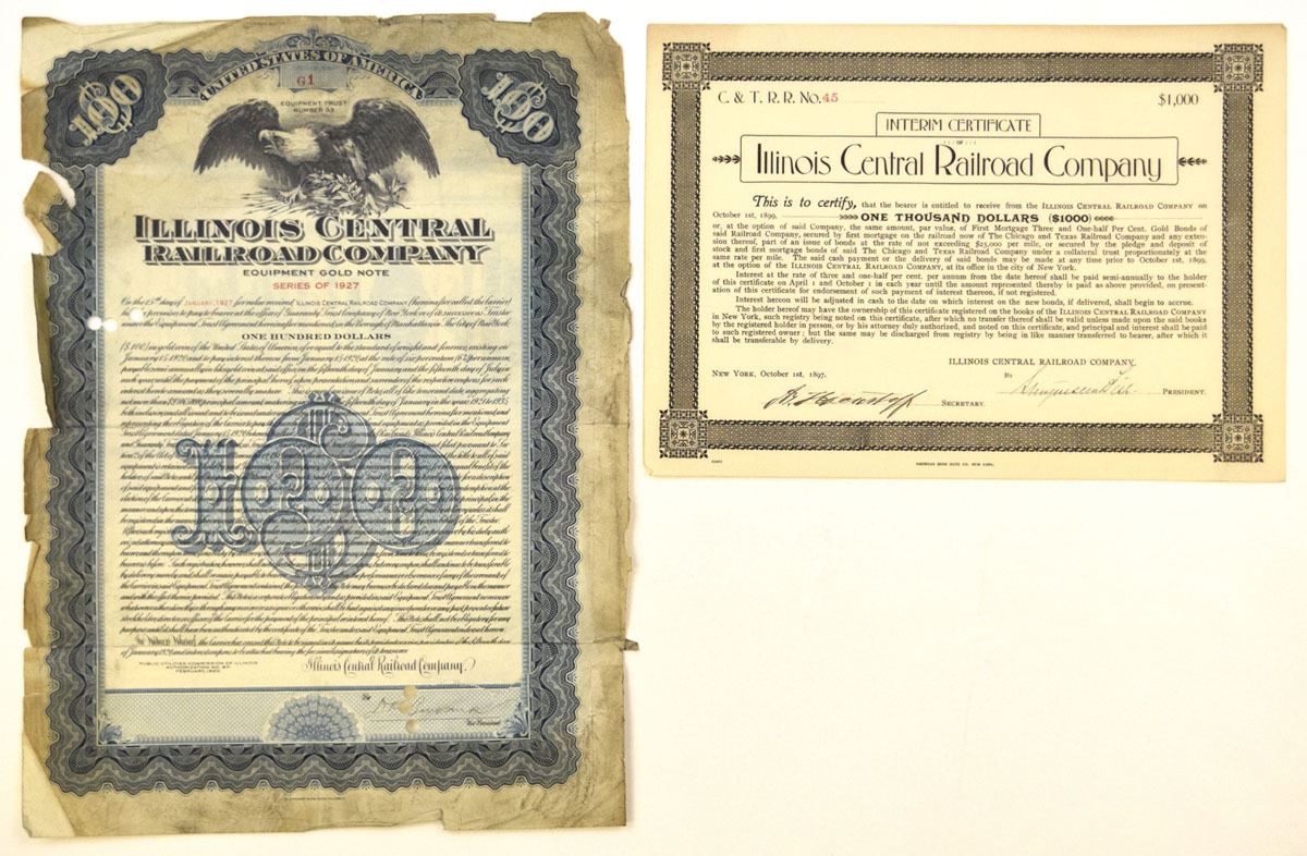 Illinois…., 1897-1920. Lot of 2 Bonds, Includes: 1897, $1000 I/U 3 1/2% First Mortgage Bond Interim Certificate, S/N 45; 1920, $100 I/C 6% Equipment Gold Note, S/N G1. Bonds are in Good with damage to XF condition. (2). Sold "AS IS" no returns accepted.
